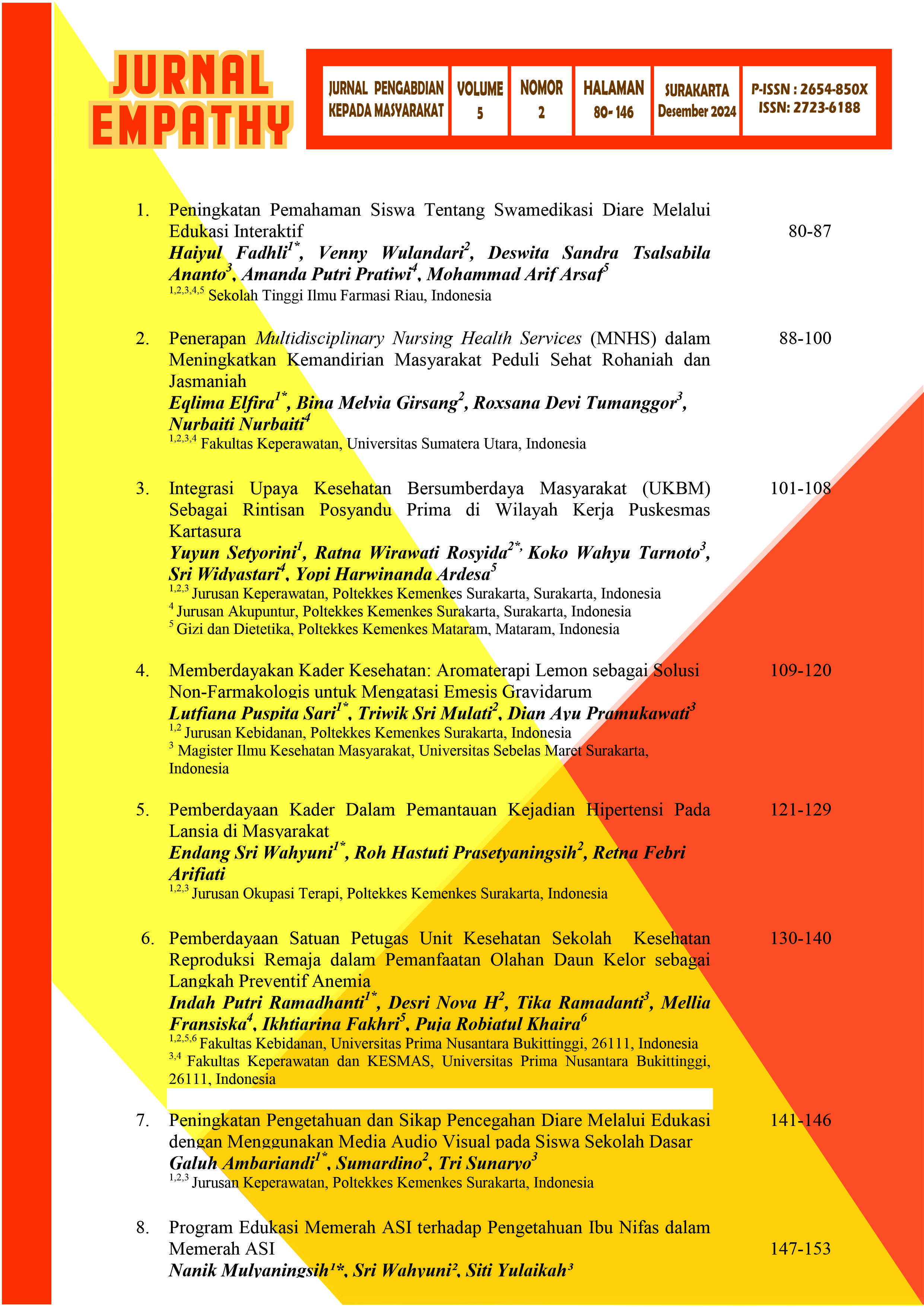 Ciptaningrum PR, Sudaryanto A, Studi P, Keperawatan I, Kesehatan I, Muhammadiyah Surakarta U, et al. Pendidikan Kesehatan untuk meningkatkan pengetahuan dan sikap anak dalam pencegahan diare: Literature review. Jurnal Promotif Preventif [Internet]. 2024;7(1):23–35.